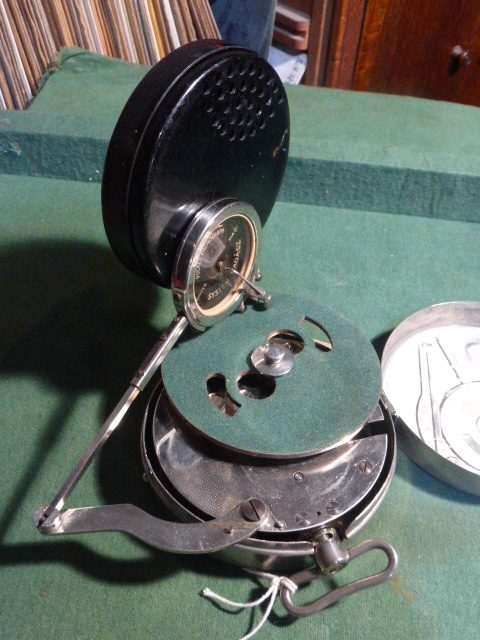 Produced in Switzerland in the early 1920s it was brought to the UK in 1926 and was one of the smallest gramophones on the market. When closed up the gramophone looks like a large pocket watch at 4.5″ across but opens out and can play a 10″ 78 on a 4 inch turntable held in place by a metal plug.