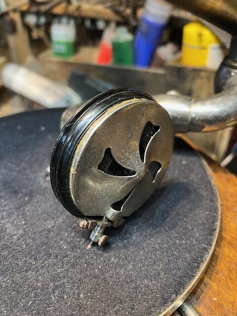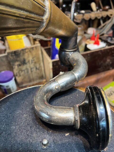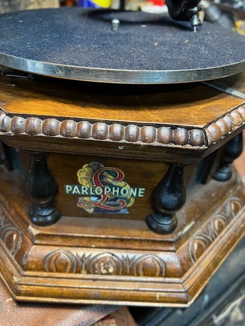The hexagonal case ( Did anyone actually make gramophones with hexagonal cases?) with glass windows is probably from India, quite elaborately made, The back-bracket looks like a Pathe item and the tone arm is from an HMV 102 portable, the brake and speed regulator are HMV parts. The sound-box is Russian as is the motor. The small brass horn is a replica. To my great surprise, the “Gramophone” works really well and I can understand why the owner set great store by it and its history. It had been, apparently, used to entertain at local events in Tavistock.